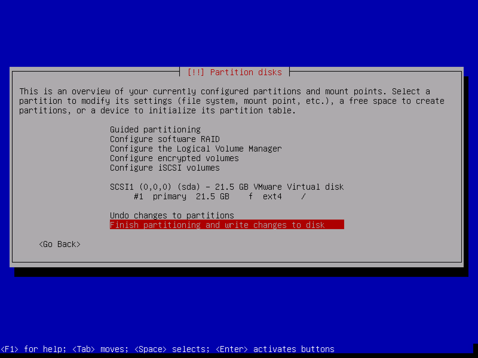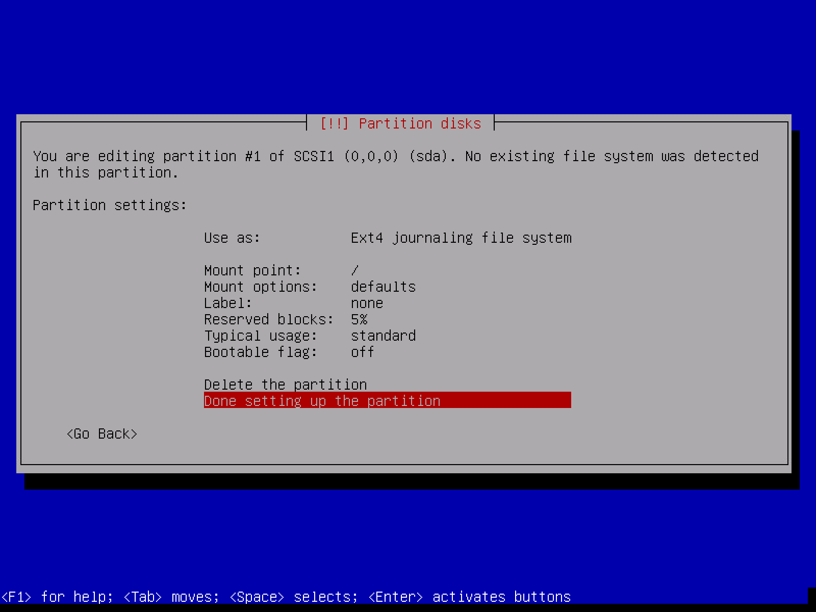 确保文件系统是 Etx4,挂载点为 / ,完成分区设置(Done setting up the partition)
