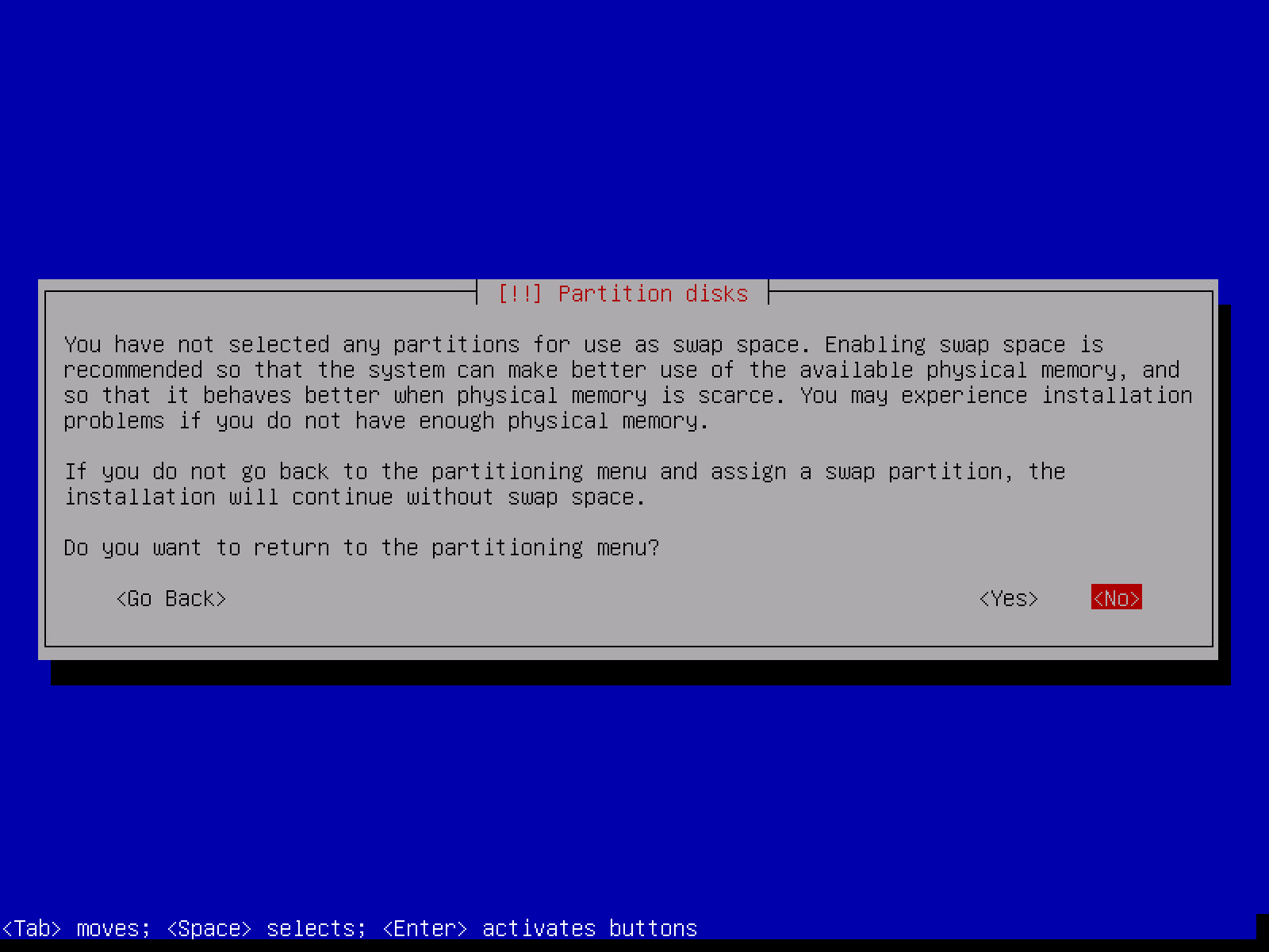 出现没有设置分区用作 SWAP 空间的警告,询问是否回到分区菜单?选择 No