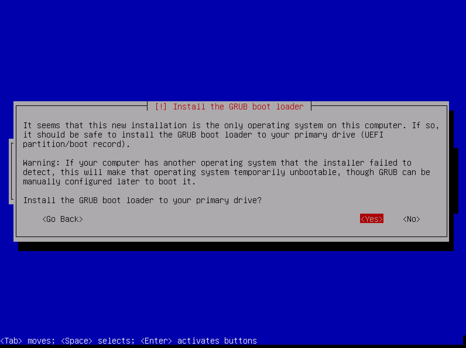 出现这个界面,是询问我们是否安装 grub 引导,我们选择 Yes,并且插上网线(虚拟机可以在管理页面连接网络)