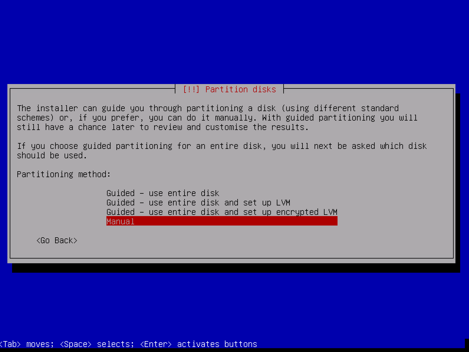 进入磁盘分区设置的界面,选择 Manual(手动分区)。