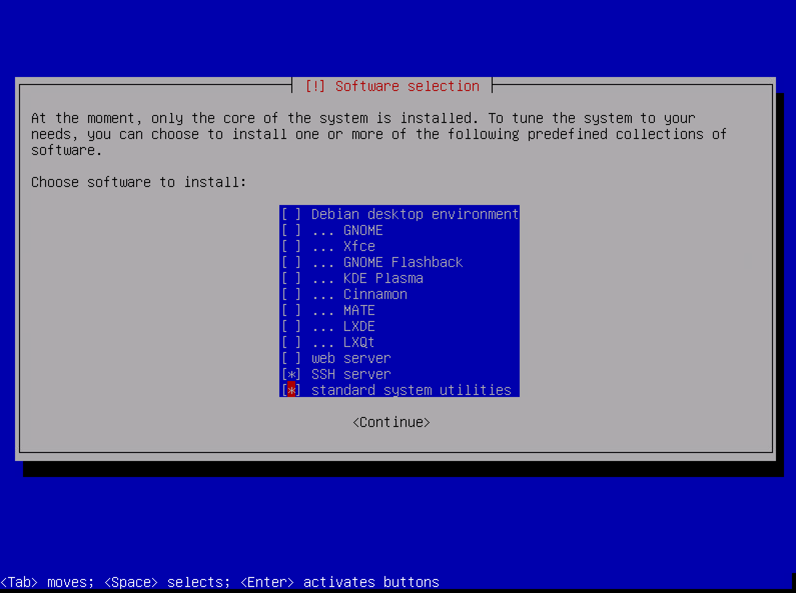 软件选择,由于我们只是需要将这个系统作为服务器环境并且是最小化安装,我们不需要安装桌面环境以及各个桌面软件包,所以这里只选择安装 SSH Server (SSH 服务器)和 Standard System Utilities(标准系统工具)就可以了。